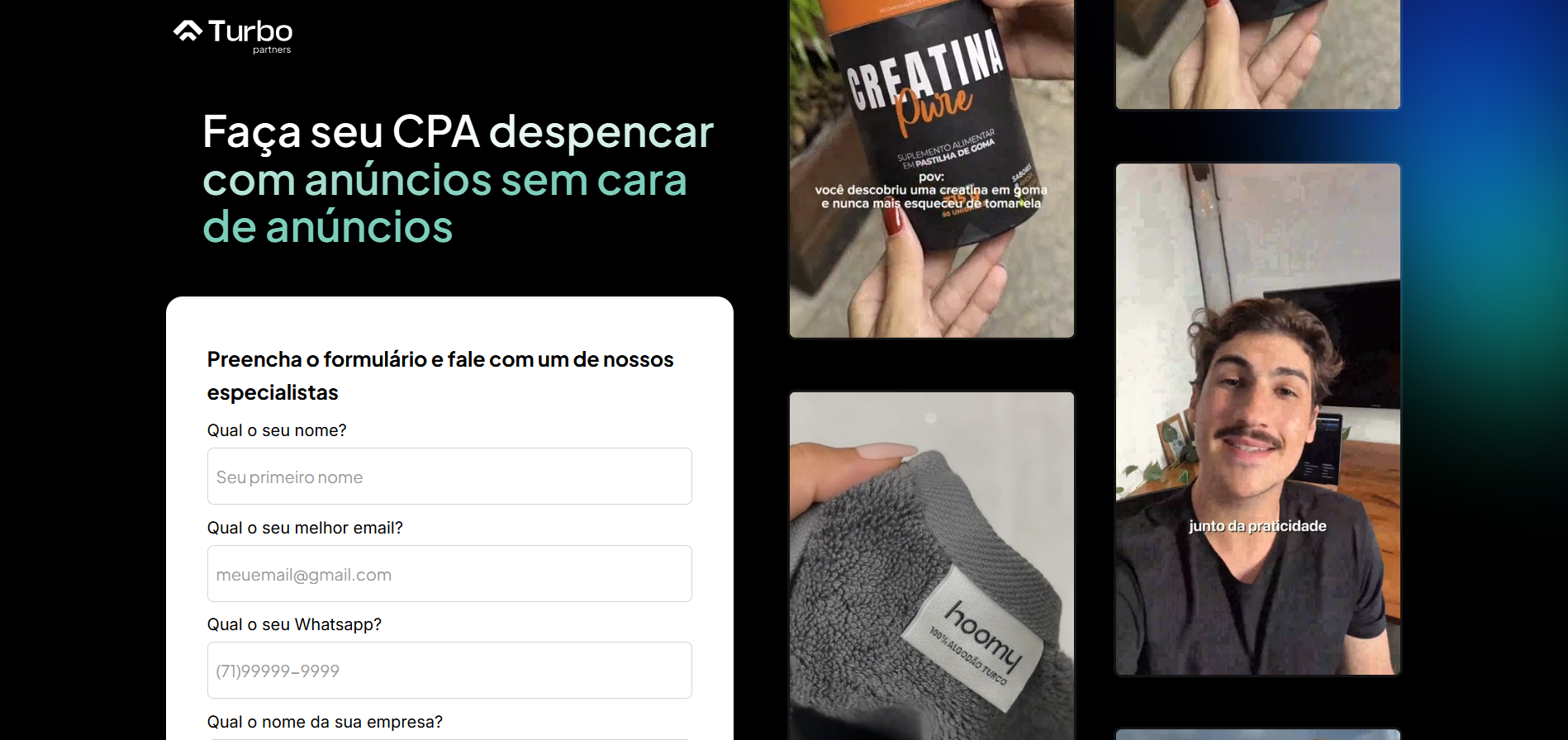 Aqui na Turbo, a gente faz seu CPA despencar com anúncios sem cara de anúncios. Tudo isso com UGCs que se encaixam com o seu negócio. Aumente seu faturamento com Turbo.